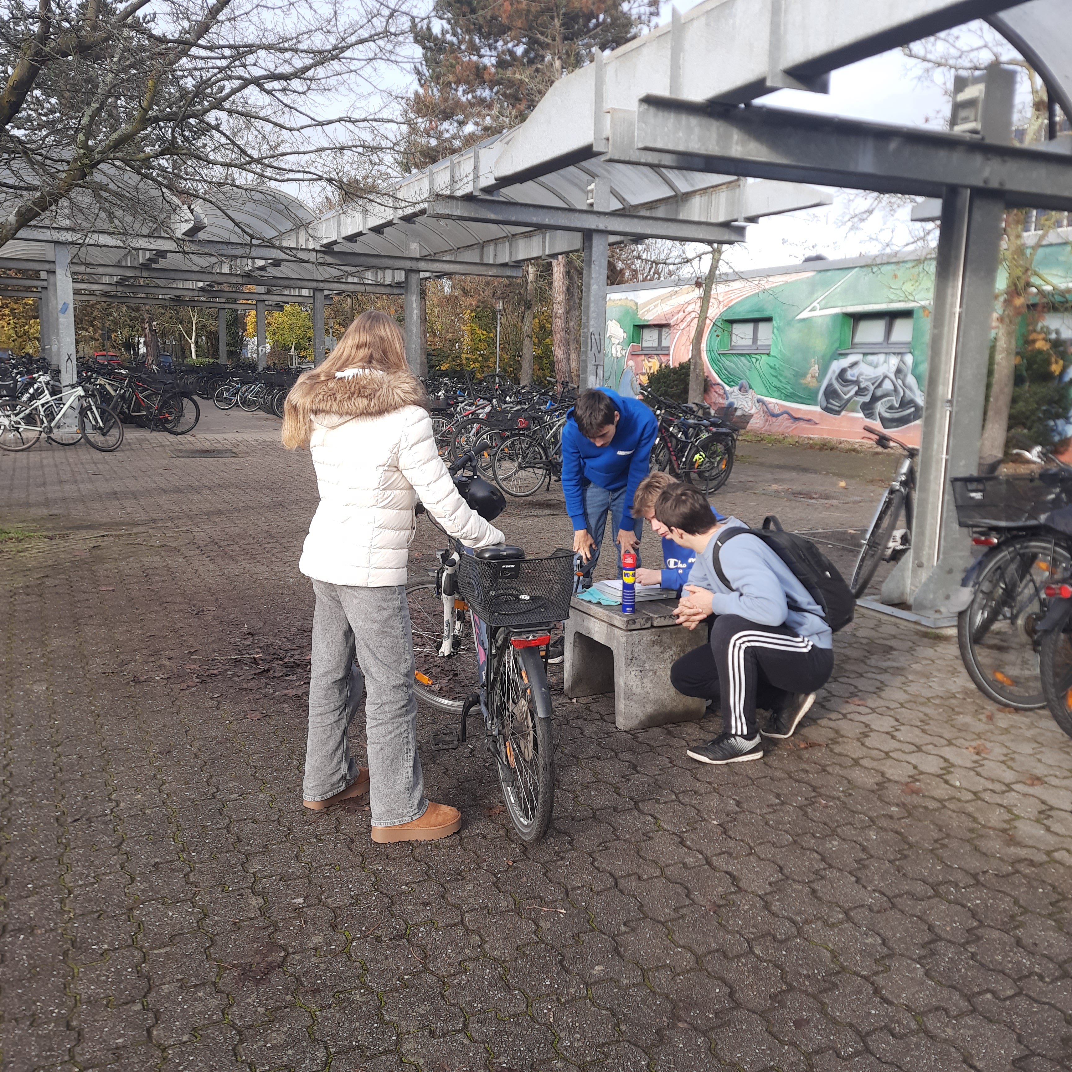 Am 11.November überprüfte die Technikgruppe der 10c die Fahrräder der Klassen 5-7 auf sicherheitsrelevante Mängel. Dabei stellte sich erfreulicherweise heraus, dass die meisten Fahrräder verkehrstauglich waren. Über kleinere Mängel und Auffälligkeiten wurden die Eltern der betroffenen Schüler über ein Schreiben informiert. Einfache Wartungsarbeiten wie das Aufpumpen der Reifen oder das Ölen der Fahrradketten wurden im Zuge der Überprüfung von der Technikgruppe übernommen.